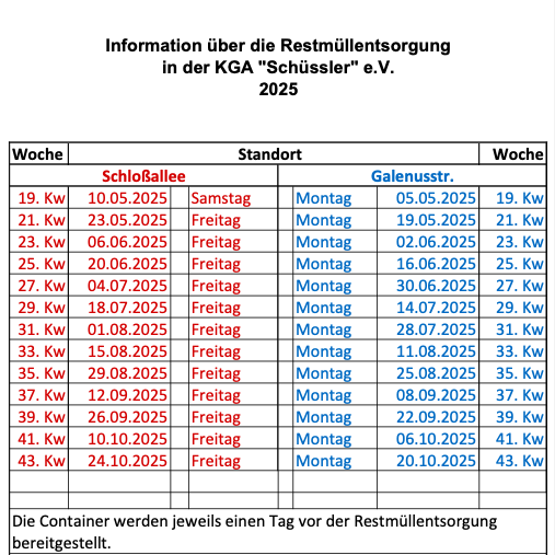 Es wird alle Gartenfreunde gebeten, nur an den ausgewiesenen Tagen Restmüll zu entsorgen und nur so viel, dass sich die Container noch schliessen lassen und nichts neben die Container abgestellt wird. So wird mitgeholfen, die Ordnung an den Standorten einzuhalten.